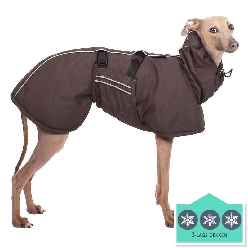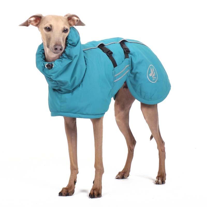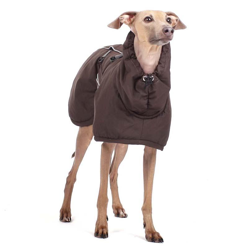 Symmetrisk lukking rundt brystet med plastspenner., sitter godt og vrir seg ikke under bevegelse Bredt magestykke dekker magen utmerket. Høy hals beskytter halsen/nakken fra både kulde og nedbør. Snittet passer italienske mynder og andre små raser.